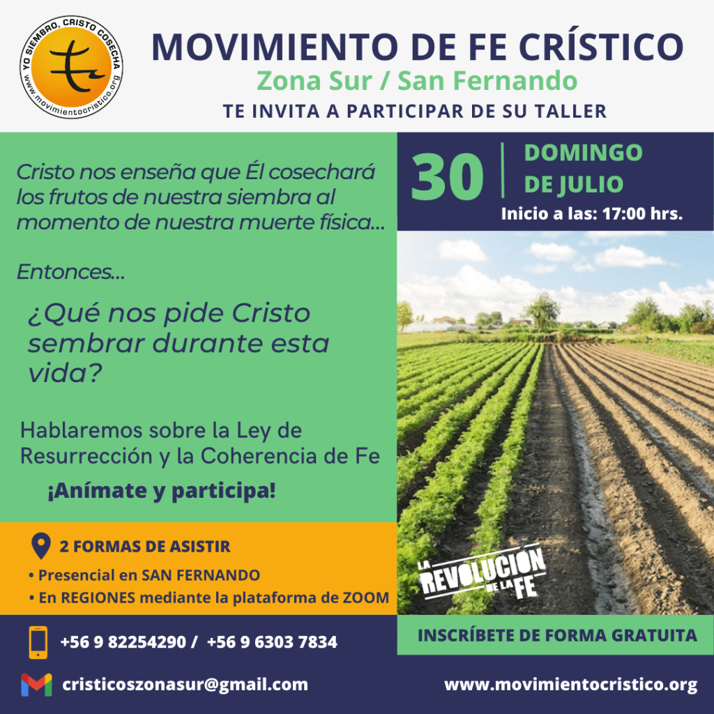 Y Si deseas participar de nuestro taller a realizarse el día domingo 30 de julio del 2023 a las 17:00 hrs. escríbenos a cristicoszonasur@gmail.com