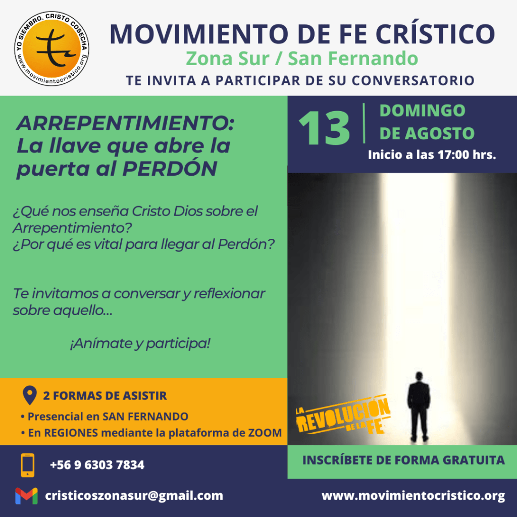 Si quieres conocer más, Anímate y participa el domingo 13 de agosto a las 17:00 hrs. En este conversatorio abierto y gratuito donde hablaremos de esta herramienta espiritual que Cristo nos enseña para llegar al perdón y aplicar en lo cotidiano nuestra Fe. Contáctame para recibir información e inscribirte +56963037834
